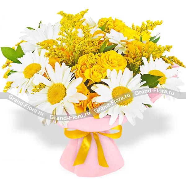 ДЕЛЮКС: ромашка белая - 17 шт, роза кустовая желтая - 11 шт, солидаго - 9 шт, рускус, шетр светлый, желтый бант.