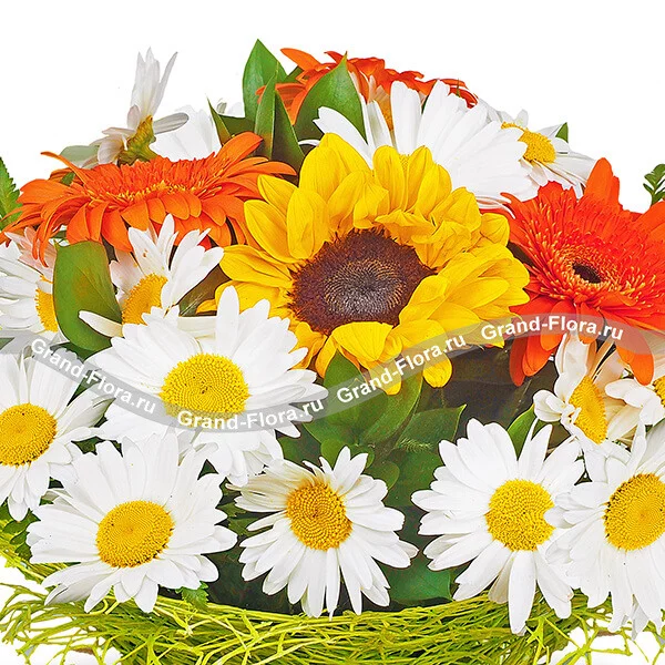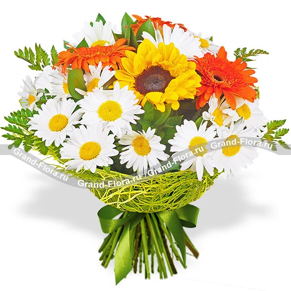 Стандартный (на фото): ромашка белая - 15 шт, гербера оранжевая - 3 шт, подсолнух - 1 шт, рускус,  папоротник - 5 шт, сетка зеленая.