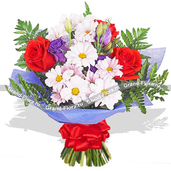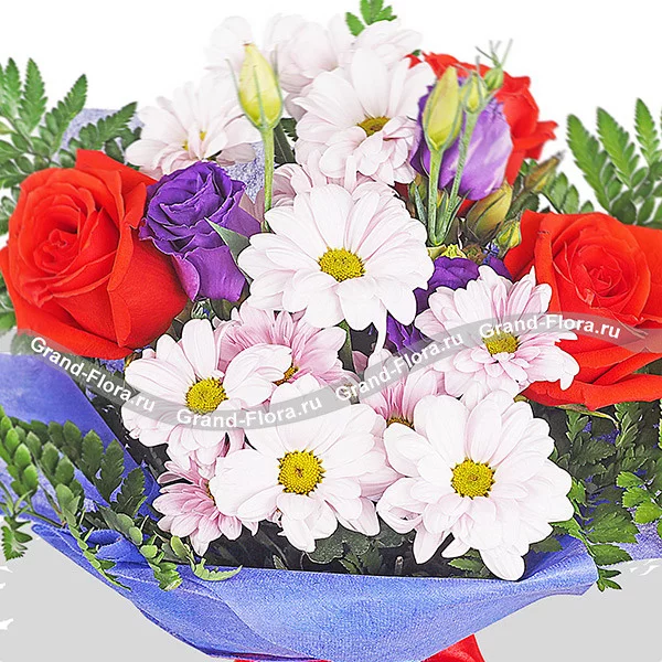 Уменьшенный: роза красная - 3 шт., хризантема кустовая светло фиолетовая - 1 шт., эустома фиолетовая - 1 шт., папоротник - 3 шт, фетр синий, бант красный.